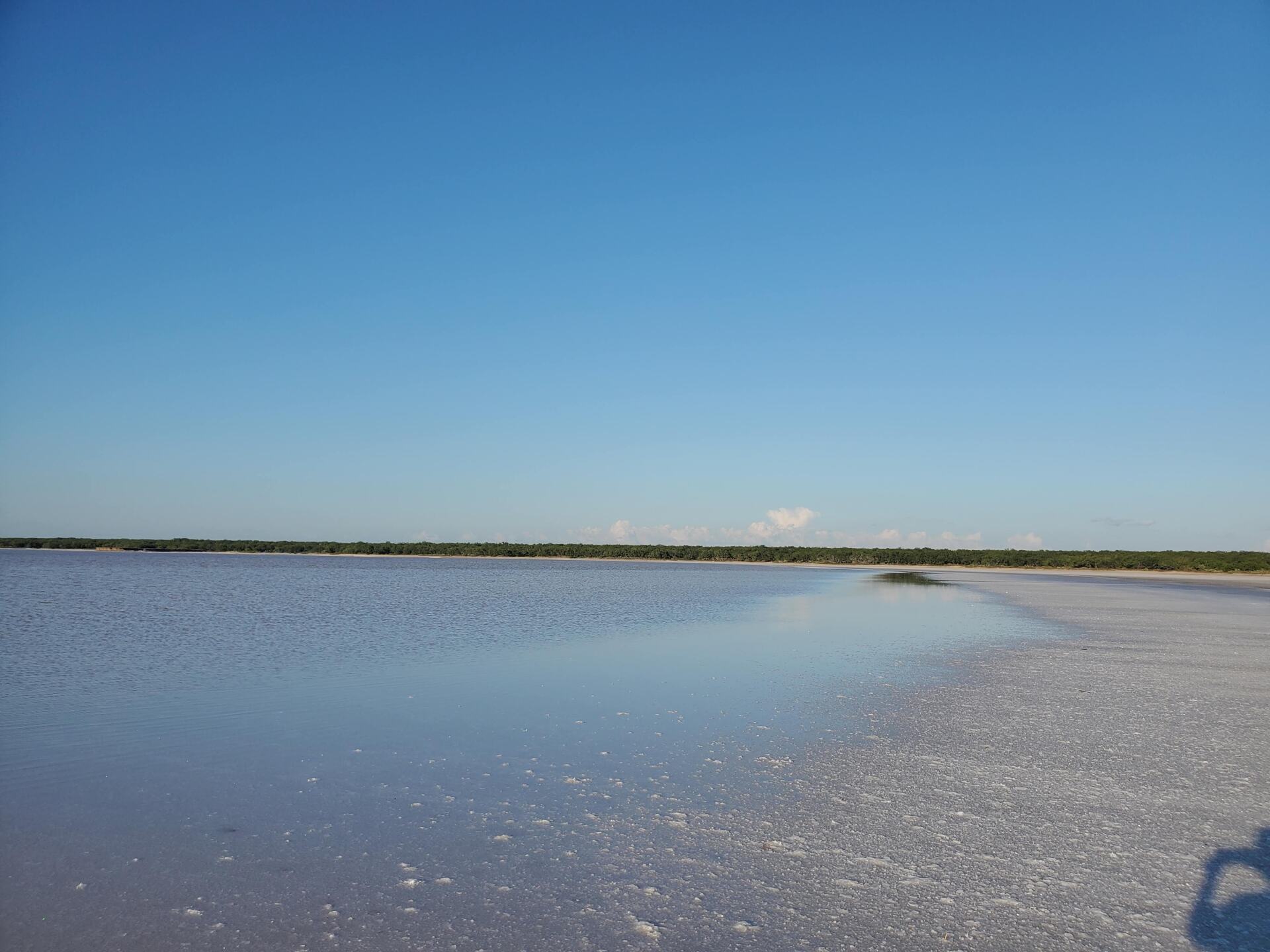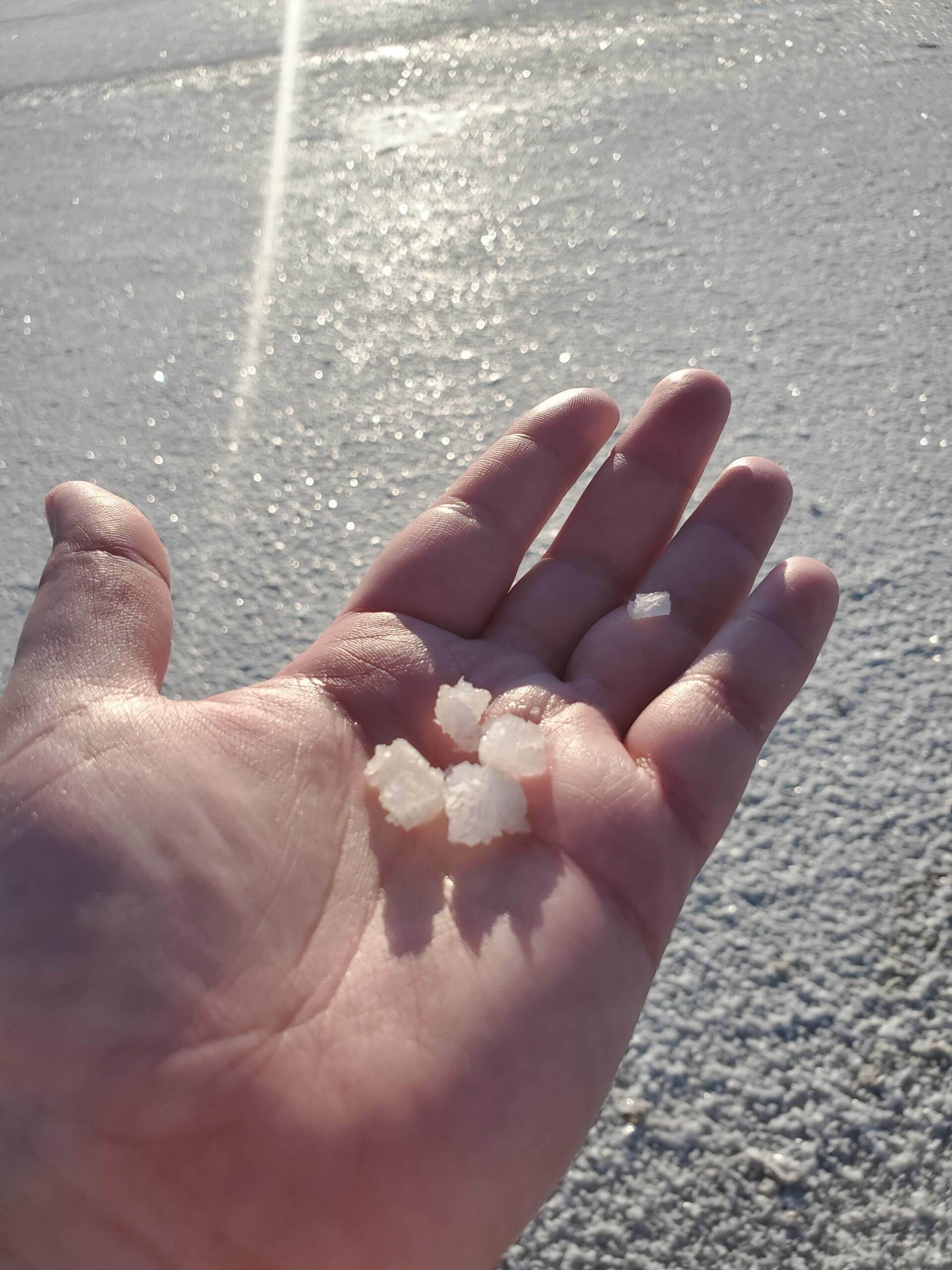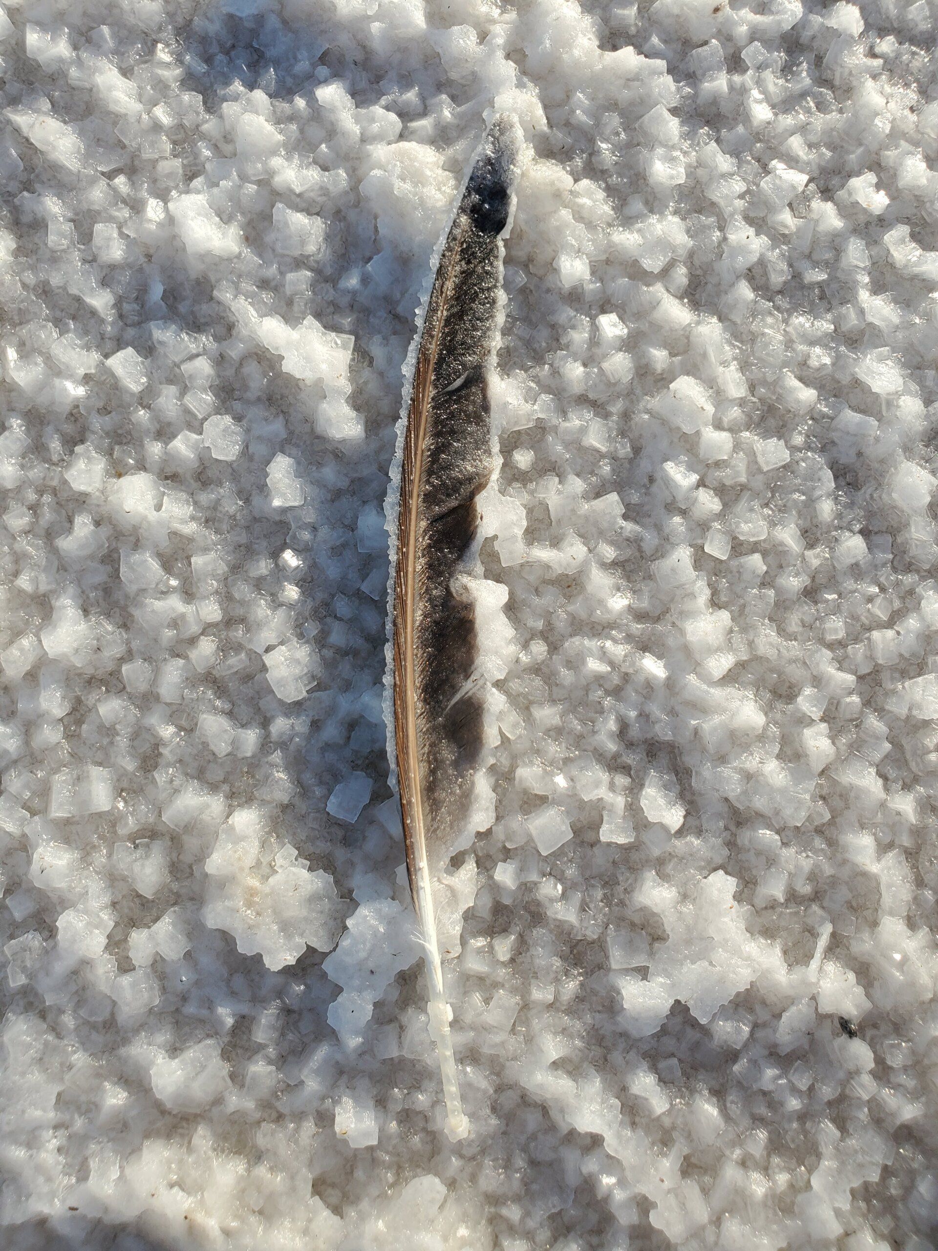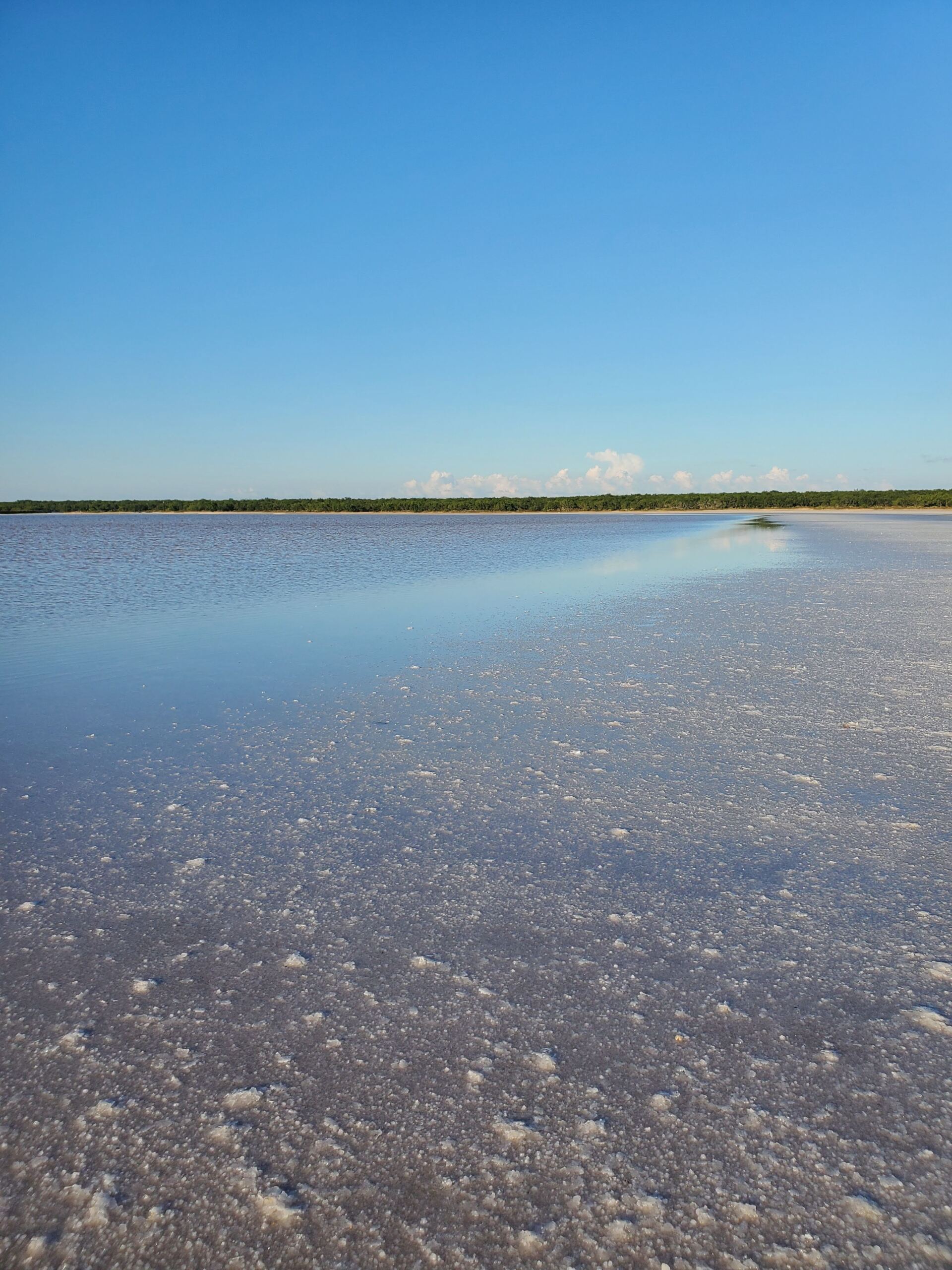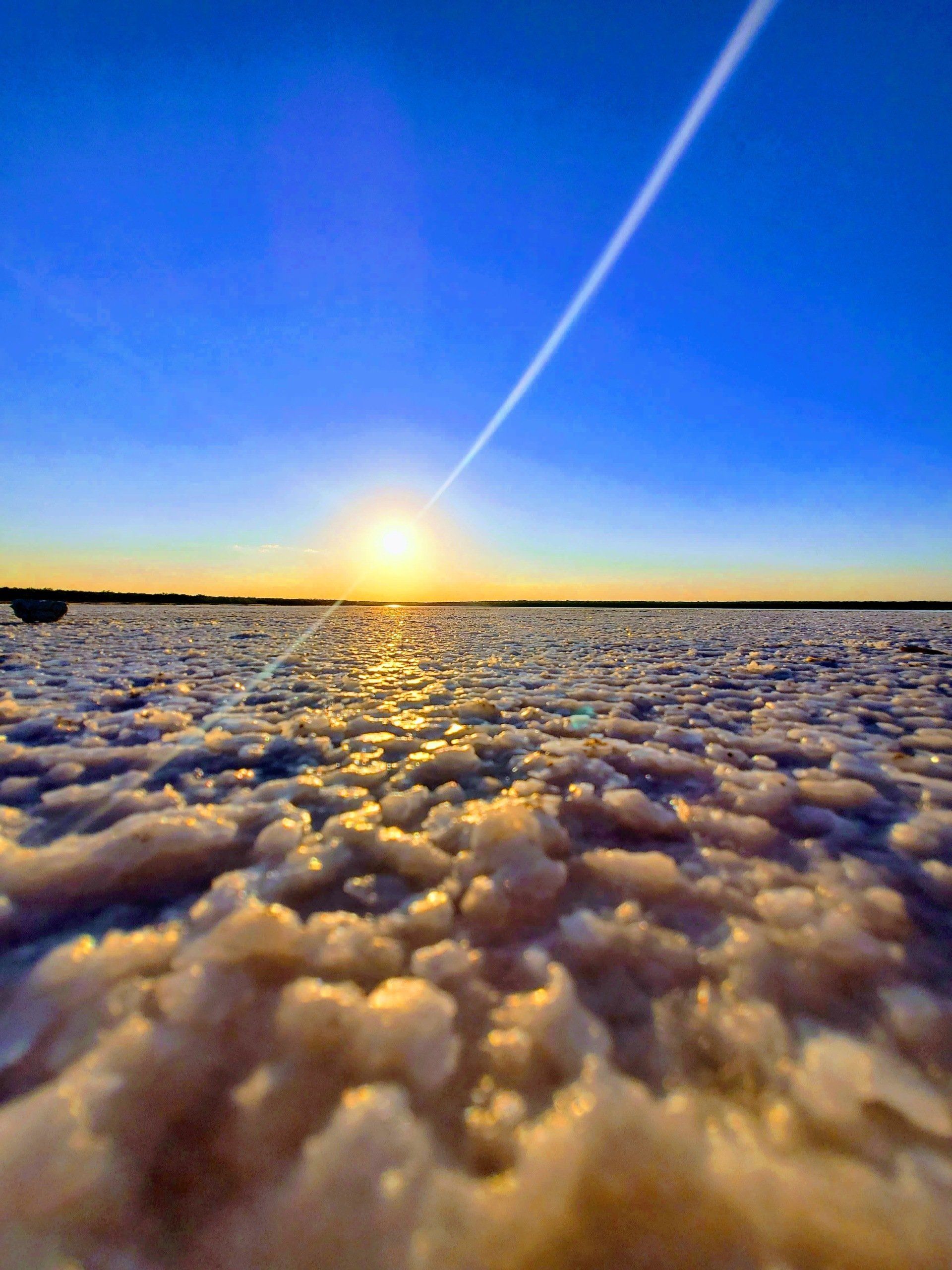 Once we reached the lake, it was an eerie feeling. Everything was dead silent and still, and there was no one or thing as far as the eye could see, except some birds that flew overhead occasionally. It was like being in some weird alternate universe, or a scene from a video game. There were all kinds of tracks from all kinds of animals, both small and disturbingly large, in the soft dirt leading up to the lakeshore, but the shore itself was entirely made of salt crystals.
